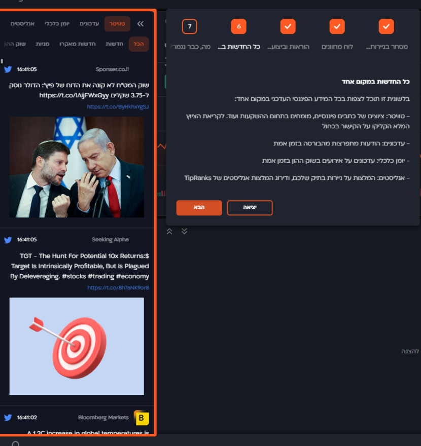 בלשונית זו תוכל לצפות בכל המידע הפיננסי העדכני במקום אחד: - טוויטר: ציוצים של כתבים פיננסיים, מומחים בתחום ההשקעות ועוד.