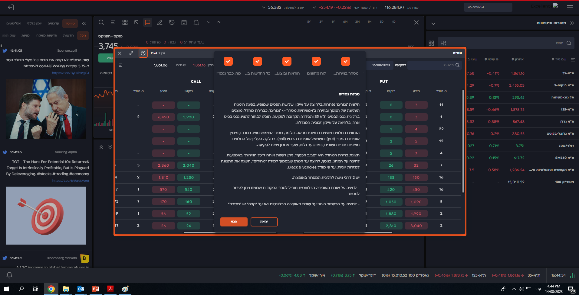 ניתן לשנות אותה ל״כל הניירות״ באמצעות לחיצה על המתג. בנוסף, לחיצה על המתג שבסמוך למילה ״מחירים״, תשנה את התצוגה לנגזרות יווניות, על פי מודל Black & Scholes. יש 2 דרכי גישה לחלונית המסחר באופציה: - לחיצה על שורת האופציה הרלוונטית תוביל לספר הפקודות שממנו ניתן לעבור למסחר - לחיצה על הכפתור הימני על שורת האופציה הרלוונטית ואז על ״קניה״ או ״מכירה״
