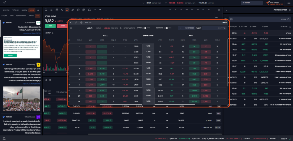 תוכלו לבחור להציג נכס בסיס אחר, בלחיצה על אייקון זכוכית המגדלת. הנתונים בחלונית מוצגים בתצוגת מראה. כלומר, מחיר המימוש מוצג במרכז, מימין אופציות המכר (put) ומשמאל אופציות הרכש (call).