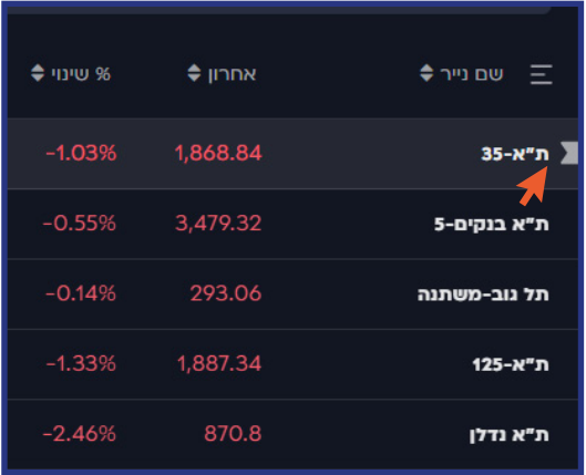 לחיצה על האייקון ""סינון"" שנמצא בתיבת החיפוש תפתח אפשרות לחפש ניירות ערך על פי קריטריון מסוים. לדוגמה, אם תרצו לצפות בכל מניות ת״א 35, בחרו בפילטרים: מניות>>מניות ישראל>>הרכב מדדים>>ת״א 35.