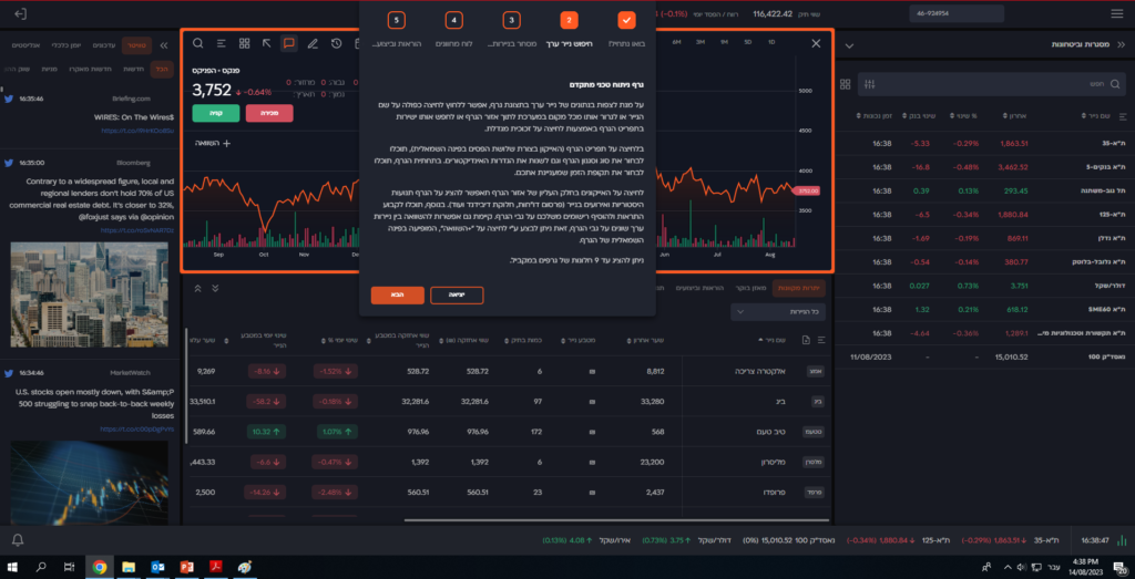 בלחיצה על תפריט הגרף (האייקון בצורת שלושת הפסים בפינה השמאלית), תוכלו לבחור את סוג וסגנון הגרף וגם לשנות את הגדרות האינדיקטורים. בתחתית הגרף, תוכלו לבחור את תקופת הזמן שמעניינת אתכם.