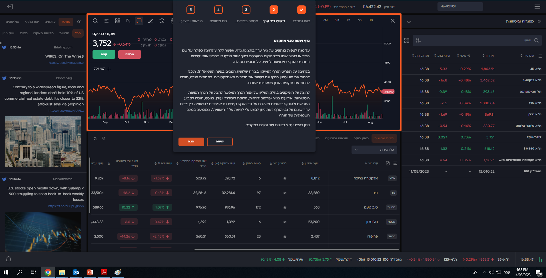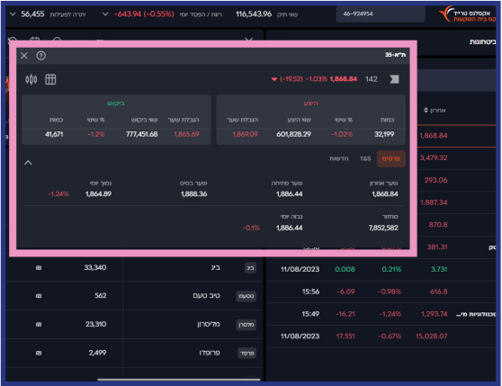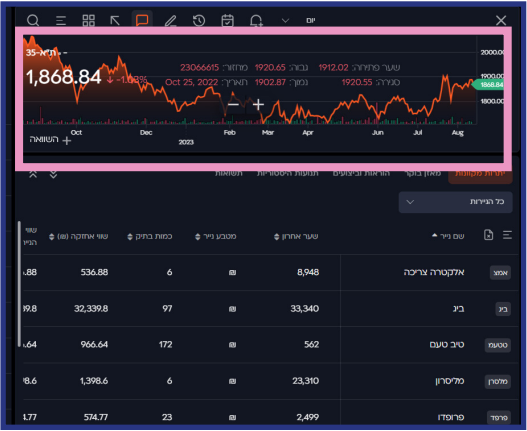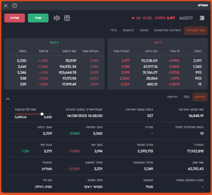 בחלקה העליון של החלונית מוצג מחיר הנייר והשינוי באחוזים שמייצגת העסקה האחרונה.