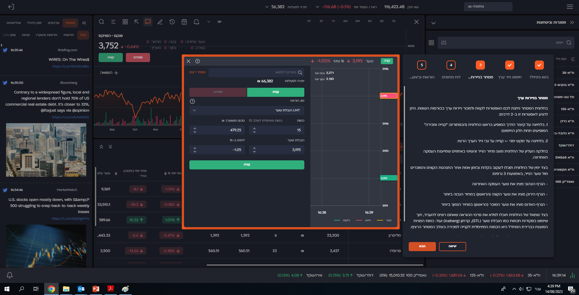 בחלונית המסחר ניתנת לכם האפשרות לקנות ולמכור ניירות ערך בבורסות השונות. ניתן להגיע לאפשרות זו ב-2 דרכים: